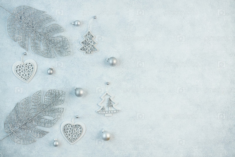 Концепция праздничного фона в серебристых тонах. Вид сверху на серебряные шарики из подарочной коробки на сером фоне. Макет фона новогодних праздников с местом для копирования