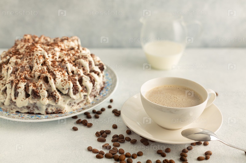 Кофе со сливками в белом наборе с кофейными зернами, кремовый торт. Напиток на светло-сером фоне