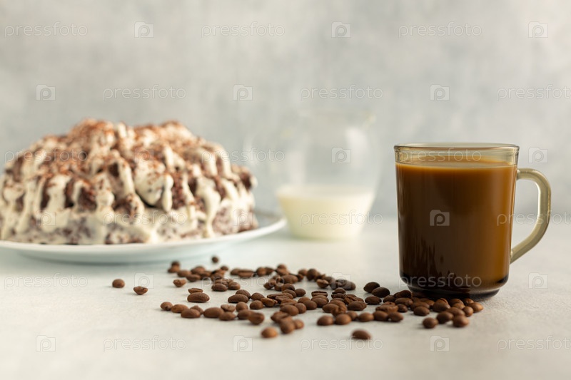 Кофе со сливками в стеклянной кружке с кофейными зернами, кремовый торт. Напиток на светло-сером фоне