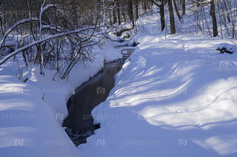 Незамерзающий ручей в зимнем лесу. Солнечный день в феврале. Москва, Узкое, Битцевский лес