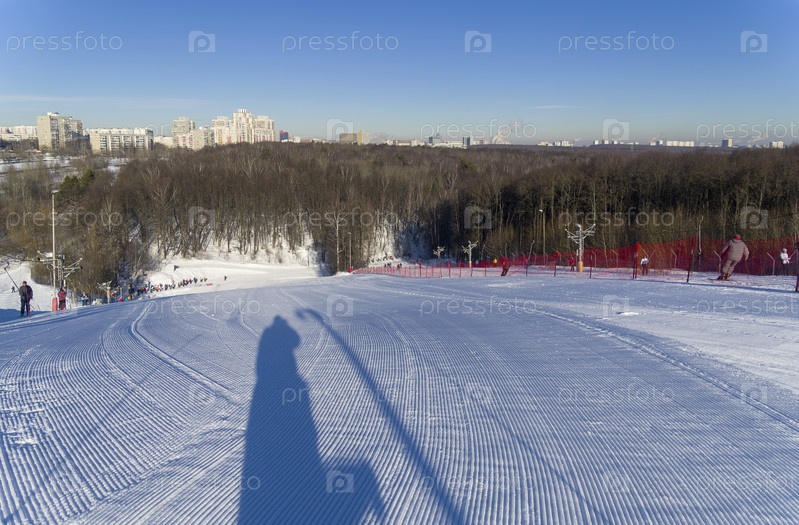 Небольшой горнолыжный склон на окраине Москвы. Солнечный день в феврале