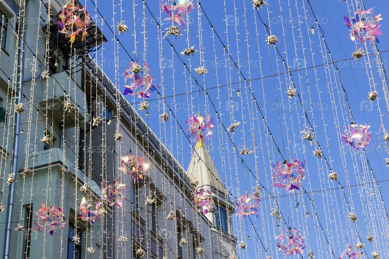 Уличная иллюминация на фоне голубого неба. Улица Кузнецкий Мост, Москва, Россия