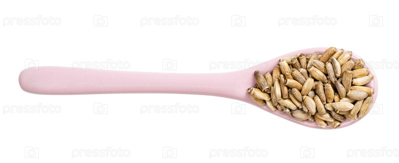 Вид сверху на керамическую ложку с семенами расторопши