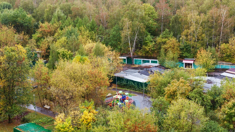 Над видом на мокрый сквер под осенним дождем