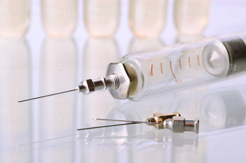 Старый шприц и флаконы