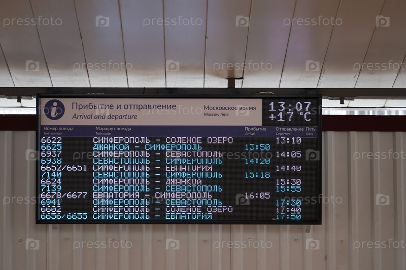 Симферополь, Крым-6 июня 2021 г.: Информационное электронное табло Симферопольского железнодорожного вокзала
