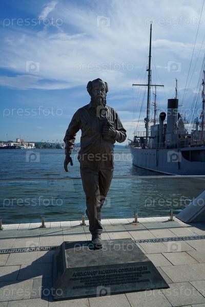 Владивосток, Россия-6 июня 2020 г.: Памятник Солженицыну на фоне набережной