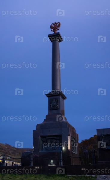 Петропавловск-Камчатский, Россия - 4 октября 2019 г.: Городской пейзаж с видом на памятник на фоне вечернего неба