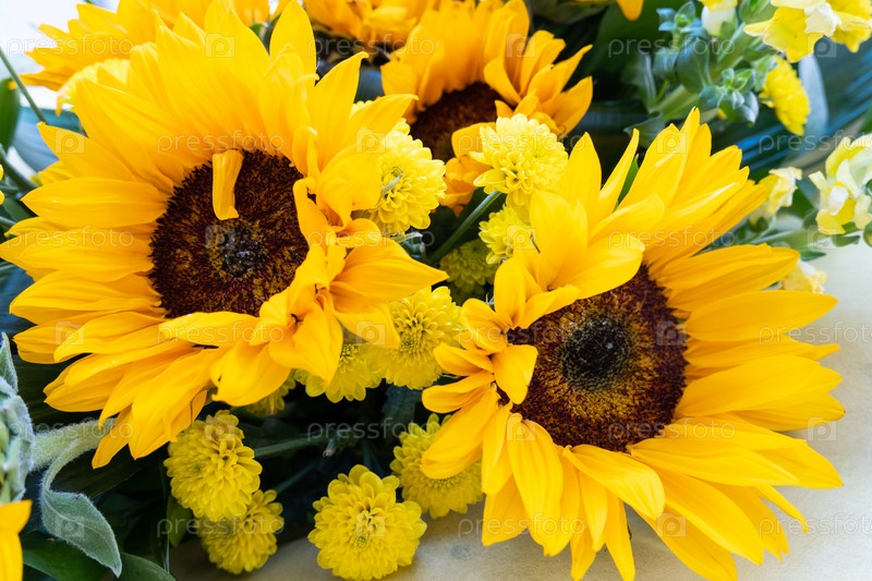 Летний праздничный букет с декоративными желтыми подсолнухами