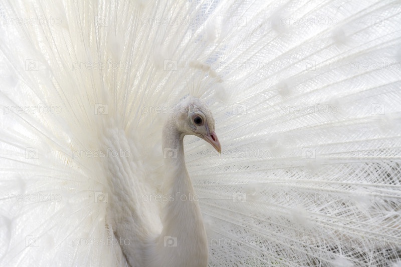 Белый альбинос красивый павлин. Крупным планом изображение птицы