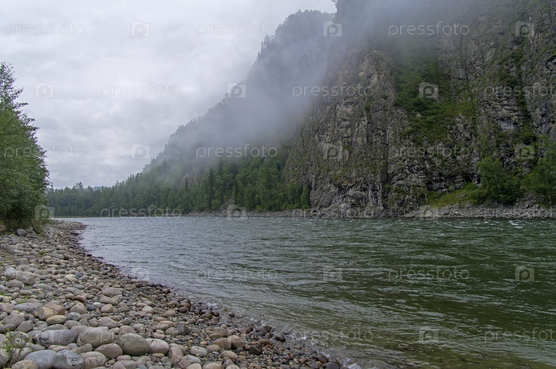 Низкая облачность над рекой Ока Саянская, Иркутская область, Сибирь, Россия. Август