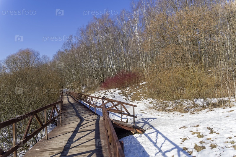 Пешеходный мостик на дне оврага. Ландшафтный заказник Теплый стан, Москва. Солнечный день в начале весны