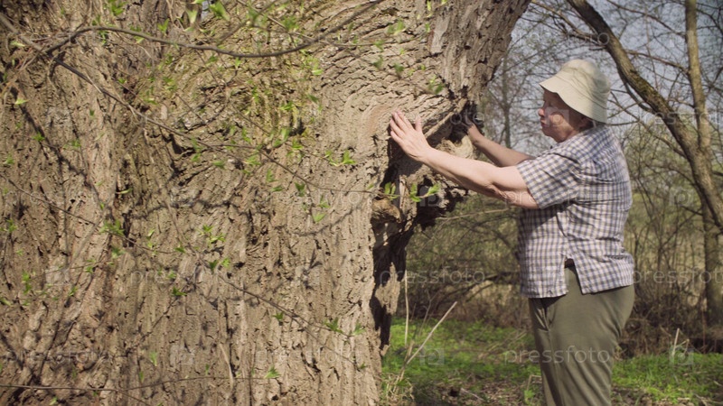 Пожилая женщина гладит большое дерево