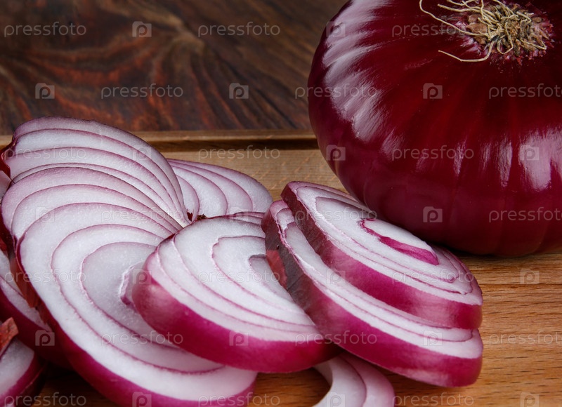 Целая луковица и нарезанный красный лук салата на деревянном фоне
