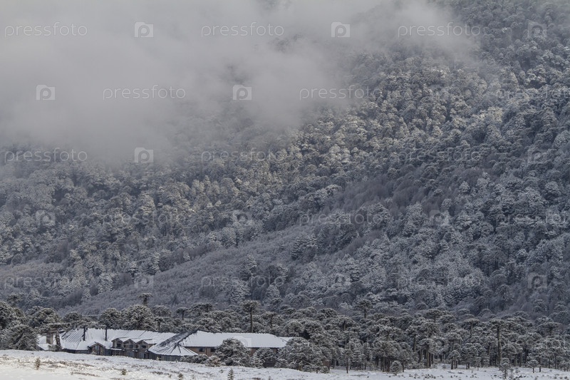 Склон горы. Лес покрытый инеем. Чили