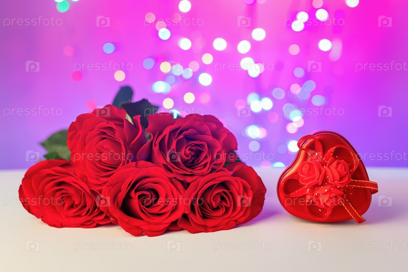 Закройте букет роскошных красных роз и подарочную коробку в форме сердца. Розовый и фиолетовый фон с подсветкой боке. Концепция романтического свидания, День святого Валентина, любовь и подарок