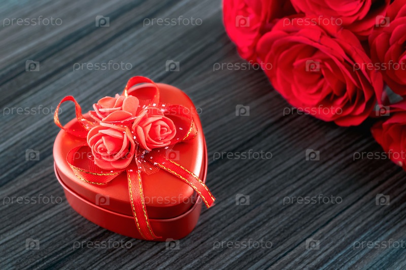 Закройте красную подарочную коробку в форме сердца и букет роз на темном деревянном фоне. Концепция романтического свидания, День святого Валентина, любовь и подарок