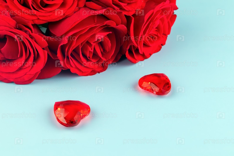 Закройте два красных сердца и букет роскошных красных роз на синем фоне. Концепция романтического свидания, День святого Валентина, любовь и подарок. Скопируйте пространство. Праздничная открытка
