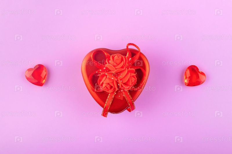 Красная подарочная коробка и хрустальные сердца на бархатном фиолетовом фоне. Романтическое свидание, День святого Валентина