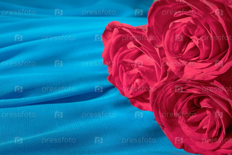 Закройте букет красной розы на синем текстильном фоне. Подарок на свидание. День Святого Валентина. Романтический подарок