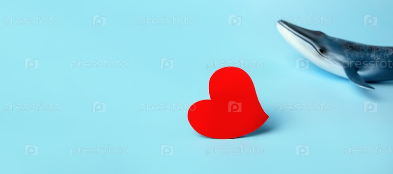 Крупным планом красное сердце и игрушечный кит на синем фоне. Концепция защиты морских животных. Проблема исчезновения гигантских млекопитающих. Всемирный день китов и День океана. Баннер с копией пространства