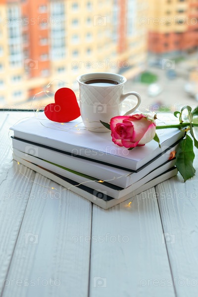 Чашка чая, красное сердце и цветок розы на стопке книг на фоне размытых жилых домов в городе. Концепция любви к чтению. Всемирный день книголюбов