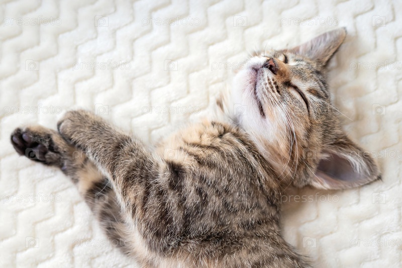 Симпатичный маленький серый полосатый котенок спит на кровати на теплом уютном бежевом одеяле. Концепция отдыха, релаксации, праздника
