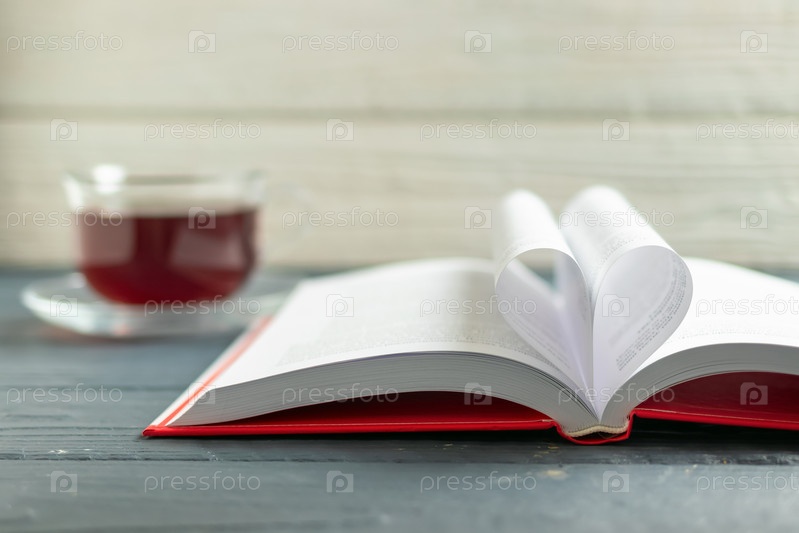 Сердце из страниц открытой книги и размытой чашки чая на заднем плане. Концепция любви к чтению. Всемирный день книголюбов