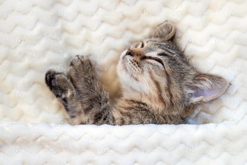 Симпатичный маленький серый полосатый котенок спит на кровати под теплым уютным бежевым одеялом. Концепция отдыха, релаксации, отпуска