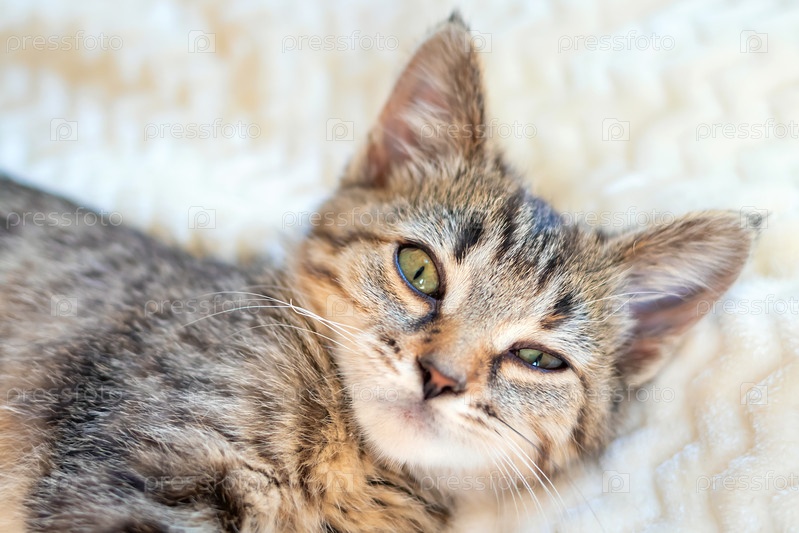 Симпатичный серый полосатый котенок с лукавым лицом расслабляется на кровати на уютном бежевом одеяле. Концепция отдыха, релаксации, отпуска