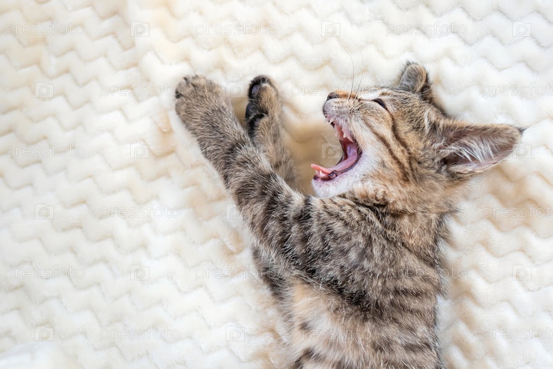 Симпатичный маленький серый полосатый котенок расслабляется и зевает на кровати на уютном бежевом одеяле. Концепция отдыха, релаксации, отпуска