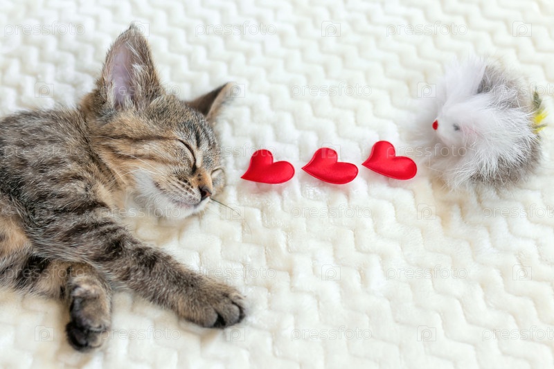 Симпатичный маленький котенок спит на кровати под теплым уютным бежевым одеялом с красными сердечками и игрушечной мышкой. Концепция мечтаний и желаний питомца