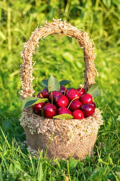 Ягоды спелых, сочных и свежих вишен в плетеной корзине на зеленой траве. Летний урожай