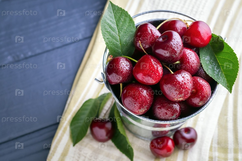 Вкусные и сочные ягоды вишни в серебряном ведре на полотенце и сером деревянном столе
