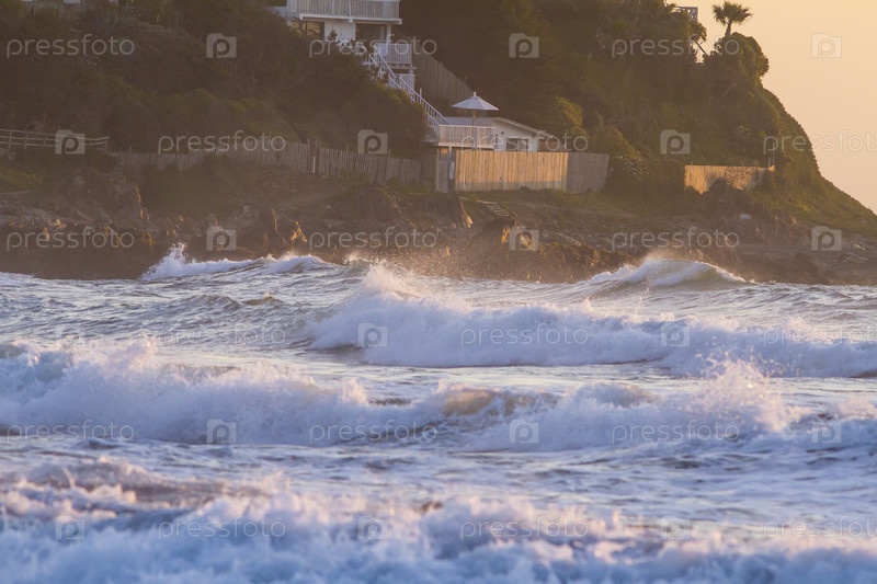 Бурное море в лучах заходящего солнца, поселок на берегу