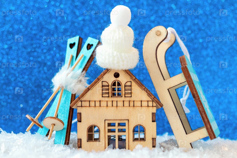 Крупный план деревянного игрушечного домика в вязаной теплой шапке на синем фоне с лыжами и санками
