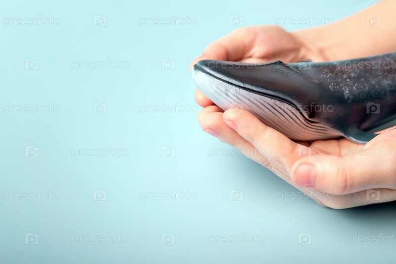 Игрушечный кит в руках ребенка на синем фоне. Защита морских животных. Всемирные дни китов и океанов