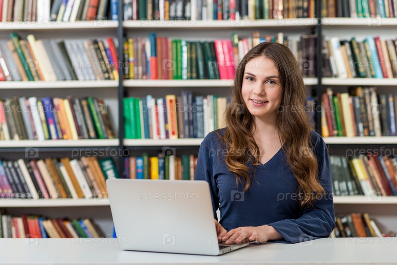 Молодая девушка сидит за столом в библиотеке, работает со своим ноутбуком, смотрит перед собой, размытые книги сзади, концепция работы