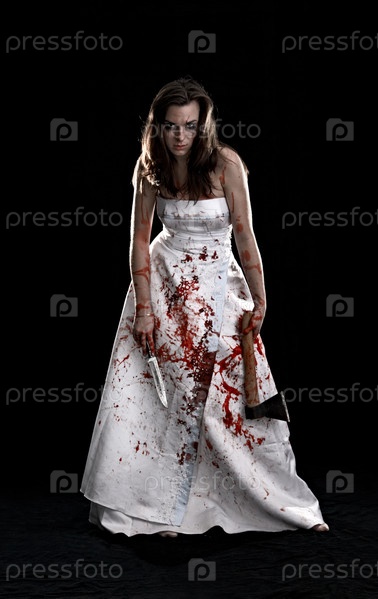 Портрет женщины с ножом и топором на черном фоне