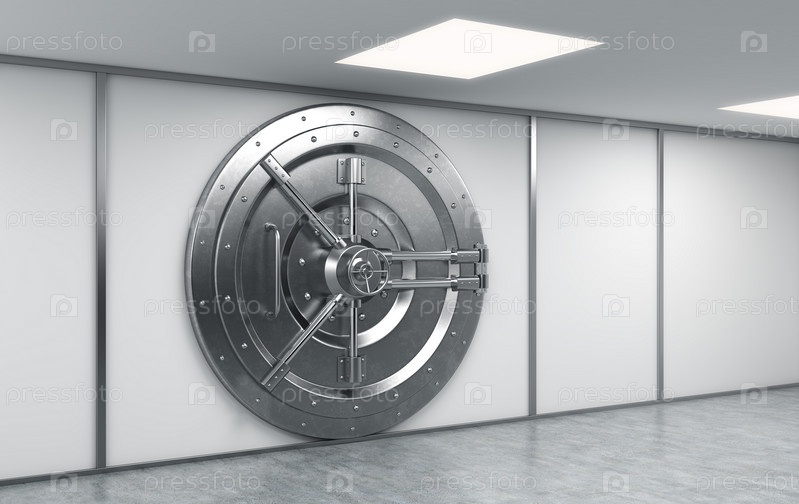 3D-рендеринг большого замкнутого круглого металлического сейфа в банковском депозитарии, концепция безопасности