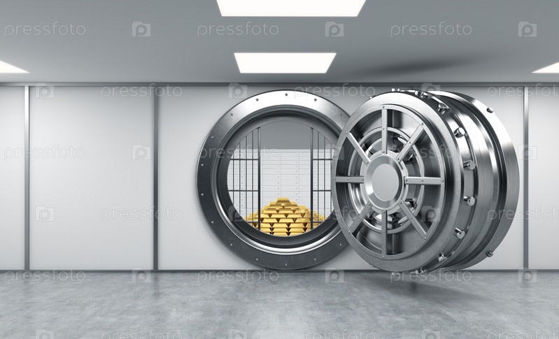 3D-рендеринг большого открытого круглого металлического сейфа в банковском хранилище с запертыми ящиками и пирамидой золотых слитков, вид спереди, концепция изобилия