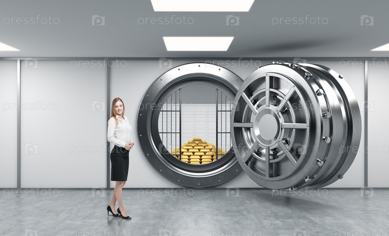 Молодая леди, стоящая перед большим незапертым круглым металлическим сейфом в банковском депозитарии с пирамидой золотых слитков и сейфами внутри, концепция безопасности и обслуживания клиентов