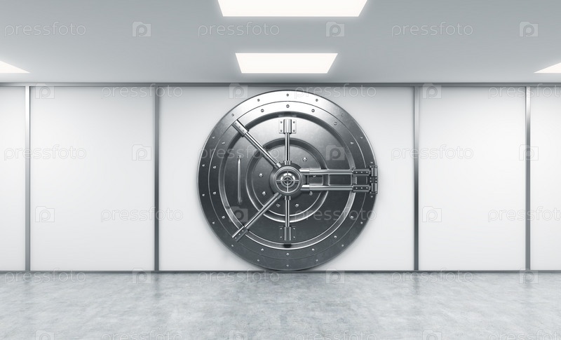 3D-рендеринг большого замкнутого круглого металлического сейфа в банковском депозитарии, концепция безопасности, вид спереди