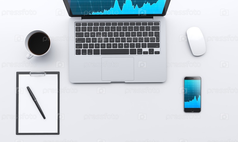Рабочее место с ноутбуком, смартфоном, кофе, блокнотом