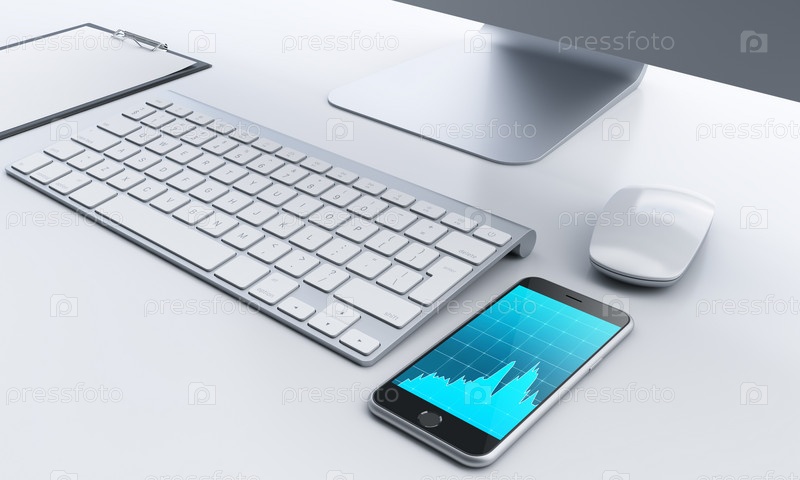 Рабочее место с компьютером, смартфоном и блокнотом