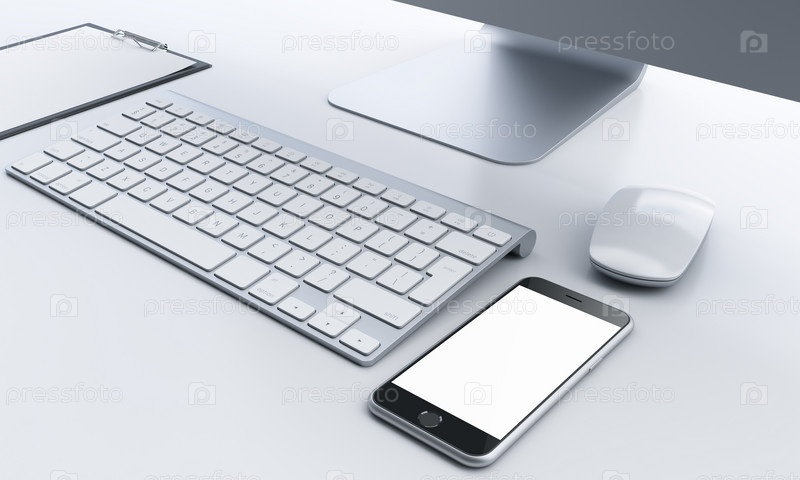 Рабочее место с компьютером, смартфоном и блокнотом