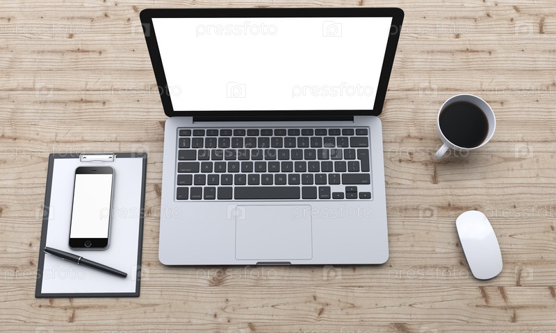 Рабочее место с ноутбуком, смартфоном, кофе, блокнотом