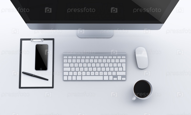 Рабочее место с ноутбуком, смартфоном, кофе, блокнотом