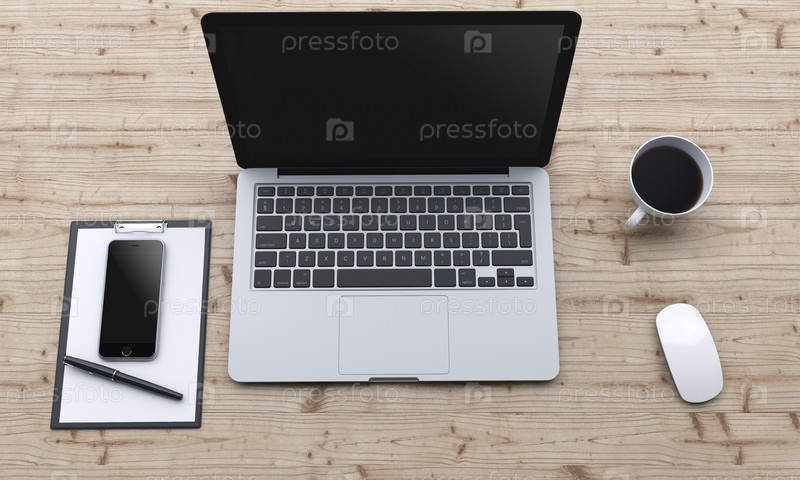 Рабочее место с ноутбуком, смартфоном, кофе, блокнотом