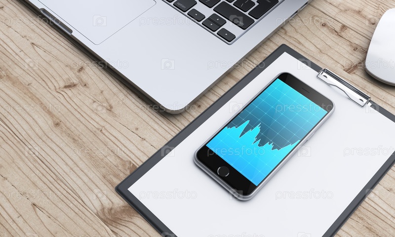Смартфон на блокноте и клавиатуре, рабочий стол